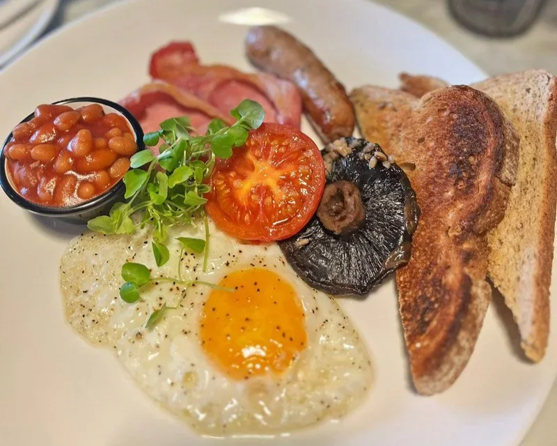 Bacon, sausage, egg, mushrooms, tomato, beans & toast